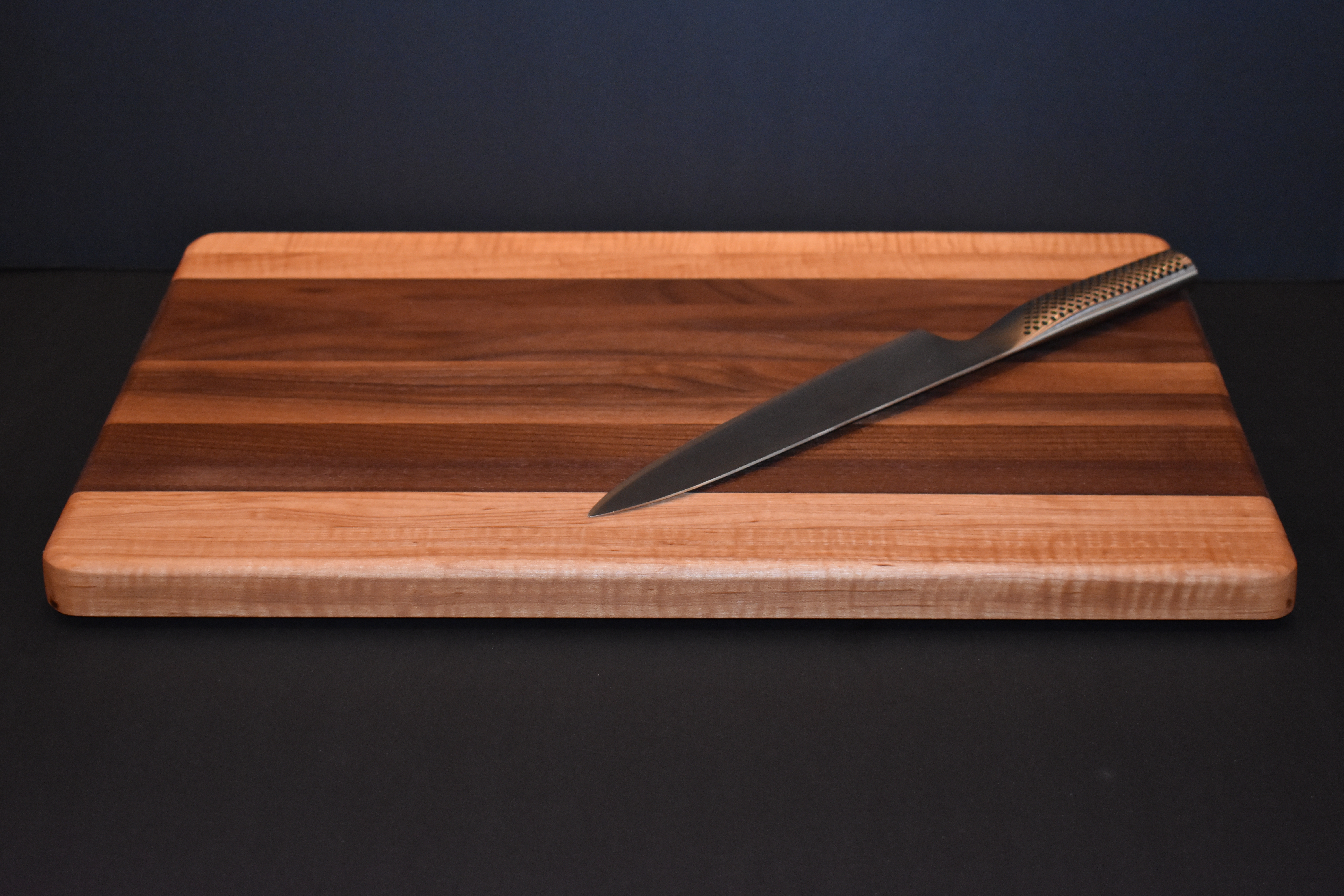 Walnut and maple cutting board. Approximately 18" x 12". There's something pleasing about the sound of knife against premium hardwood. Keep dry and clean with mild detergent and a soft cloth. Maintain with butcher block oil.Click for larger image