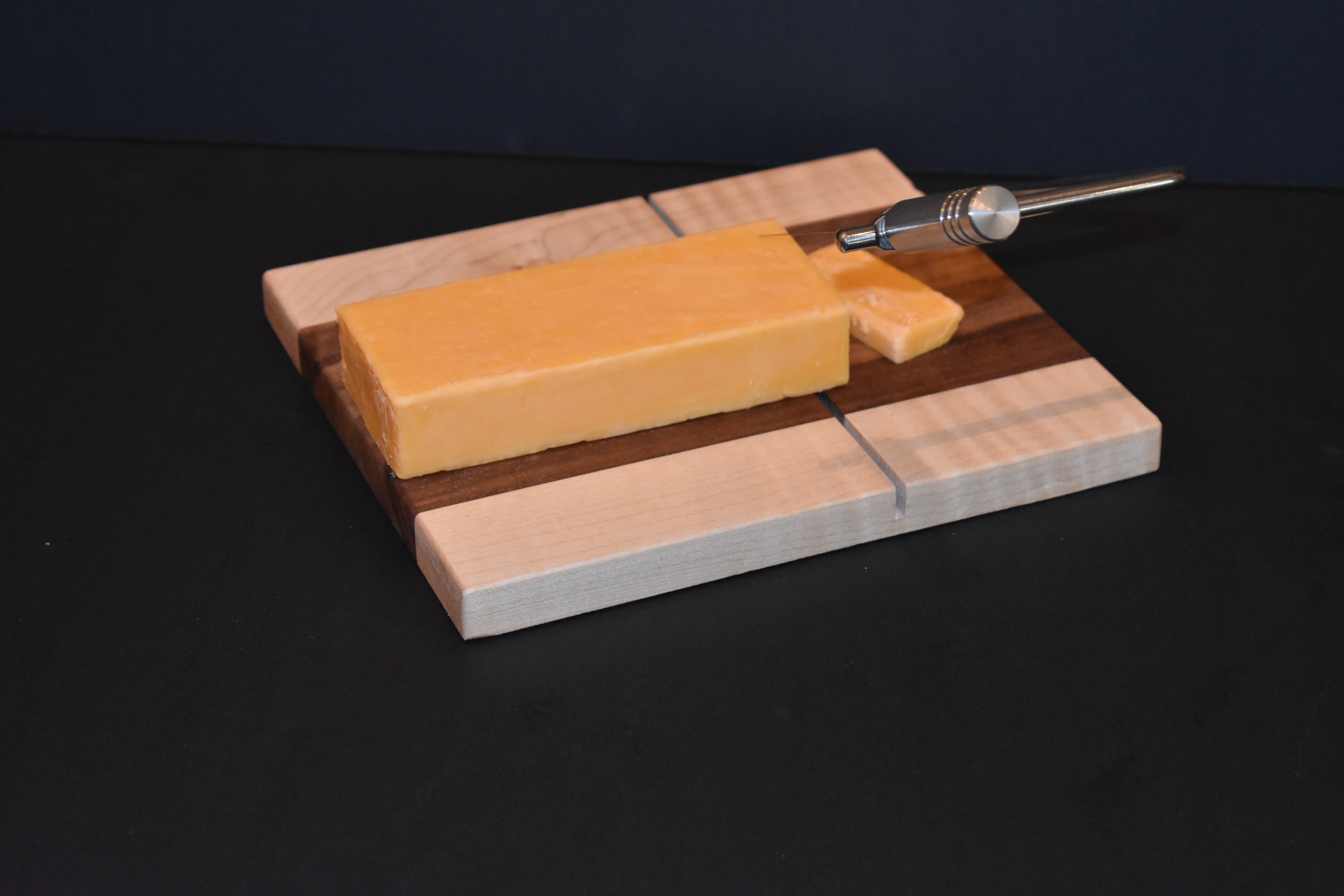 Cut the cheese with ease! This 8" x 7" cheese board will easily accommodate 2" thick standard blocks of hard or soft cheese. Made from premium woods, this will serve you for years to come. Includes extra razor wire.Click for larger image